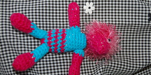 I hope he is just the first in a bunch of cuddly cuties, so that the next time I can make the ears and nose somewhat different and more to my liking. But still now, I think hi is cute and almost what I expected to come out of the pattern!