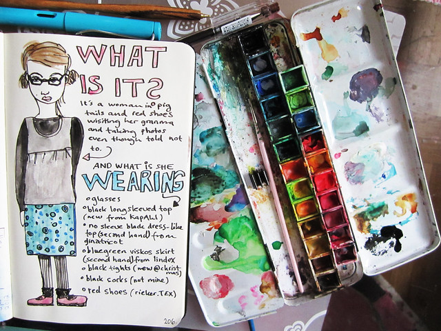 Then I decided to draw What I wore today, something that I do occasionally in my diary, just for fun. The idea to draw what you wear is inspired by Gemma Correll, who started the fashion flickr group What I wore today (in drawings). Recently she also published a book on the same topic, a book that I am adding to my wish list for sure. In the group, Gemma writes: